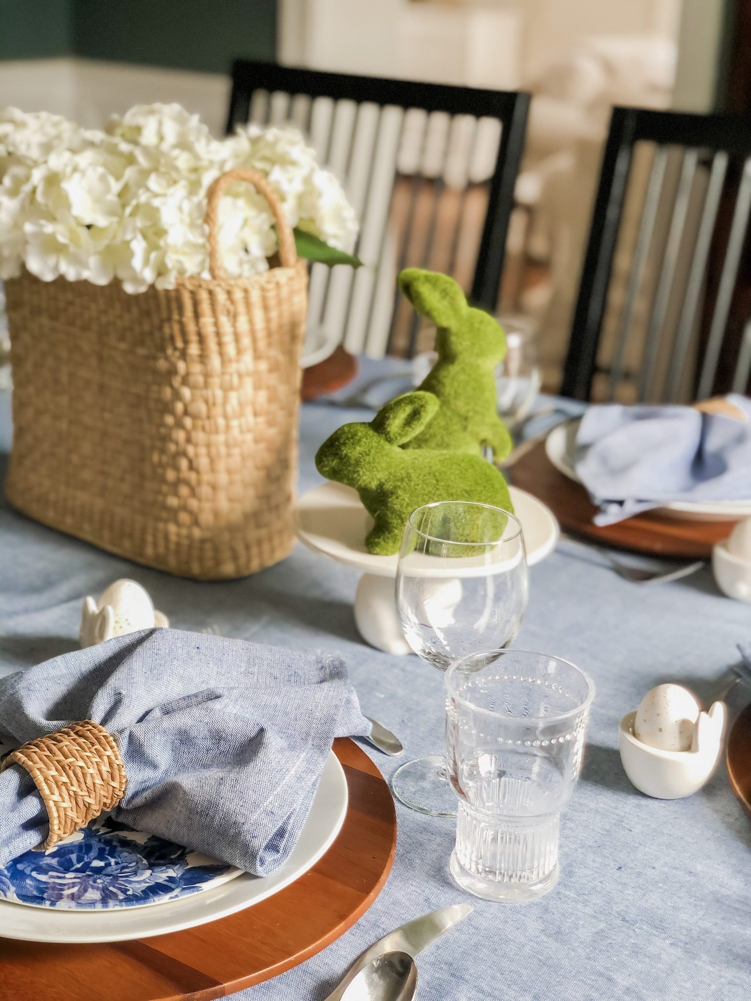 BLUE AND RATTAN EASTER TABLE SETTING