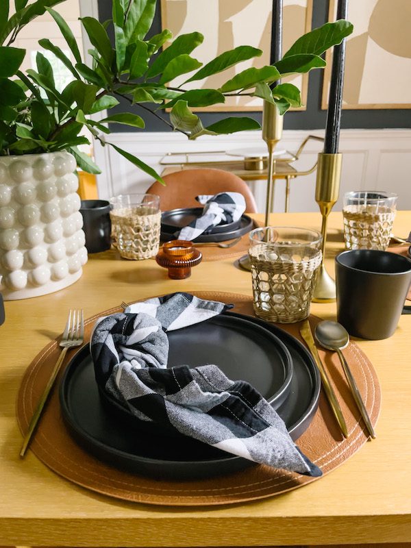 Then, I broke the rules on where the utensils are “supposed” to go and tied my modern gold flatware together with a luxurious velvet ribbon in a similar color as the table runner. This was a nice low-cost way to have a napkin ring substitute. Plus, bows are currently trending – so it was fun to add a touch of that to the table.