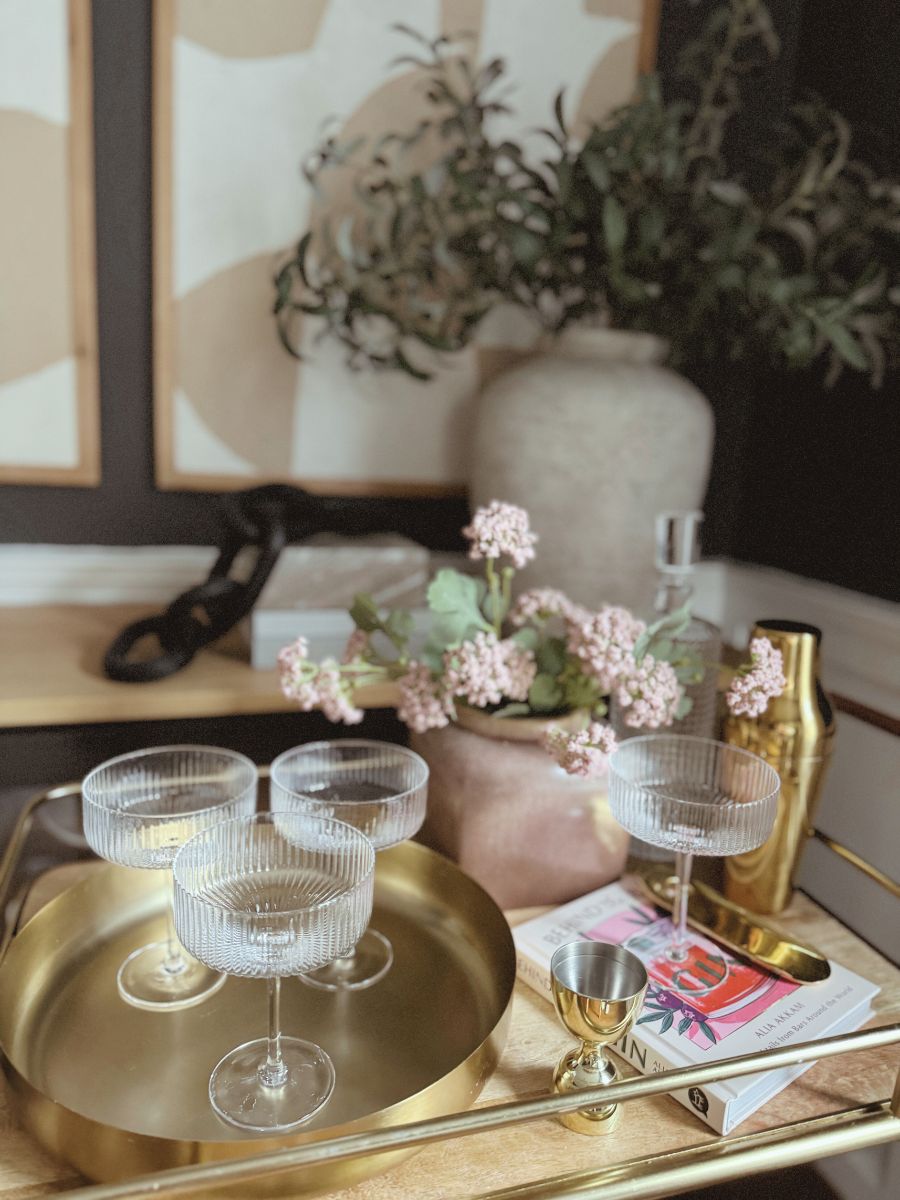 Lastly, glassware. I used my new fluted coupe glasses I received for Christmas along with fluted water glasses that I’ve posted about here and here. We use them as our daily glasses, and I love them for tablescapes and also iced coffee. So pretty and fit the vibe perfectly.
